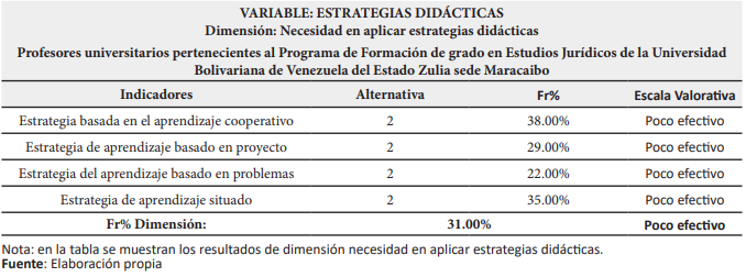 Para la dimensión necesidad en aplicar estrategias didácticas, se concluye que, los docentes encuestados manifestaron que el indicador estrategias didácticas logró ubicarse en la alternativa 2 con un valor porcentual del 31.00%, situándolo en una escala valorativa de poco efectivo, según el baremo categoría de análisis para la interpretación de la variable, pudiéndose notar entonces que los involucrados en esta investigación al momento de desarrollar sus clases, casi nunca toman en cuenta lo referido a las estrategias didácticas para reforzar el proceso de enseñanza aprendizaje.