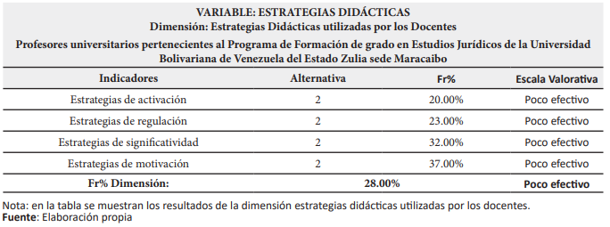 Mientras que en la tabla 2, se muestran los hallazgos de la dimensión Estrategias Didácticas utilizadas por los Docentes, los resultados arrojaron que, dicha dimensión se ubica en una frecuencia del 28.00%, esto quiere decir que la alternativa se ubicó en rango de 2, permitiendo una escala valorativa de poco efectivo, esto debido a que muy poco los docentes utilizan vías que posibiliten la actuación consciente y comprometida de los estudiantes en el aprendizaje de la asignatura, así mismo, muy poco se verifica y valora el desempeño de los estudiantes y finalmente dijeron, existe una carencia de motivación del docente hacia los estudiantes para el proceso de aprendizaje.