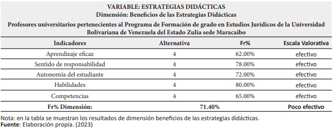 Otro de los elementos que se quiso develar fueron los Beneficios de las Estrategias Didácticas; para esto se consideraron los indicadores: aprendizaje eficaz, sentido de responsabilidad, autonomía del estudiante, habilidades y las competencias. Todo esto arrojó un resultado en la dimensión del 71.40%, ubicándose en una escala valorativa efectivo, esto da a demostrar que, el sentido de responsabilidad a nivel académico, ayuda a que los estudiantes puedan cumplir de la mejor manera sus actividades educativas, igualmente, la autonomía de los estudiantes en el aprendizaje hace que se desarrollen como seres humanos críticos e independientes y por último, las habilidades son cómo el estudiante capta la información que ve y oye; cómo procesa y guarda la información en su memoria para luego utilizarla para razonar y resolver problemas.