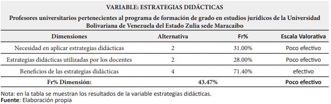 This article aims to propose teaching strategies to strengthen the teaching-learning process in the Legal Studies Degree Program of the UBV, Maracaibo-Venezuela headquarters. Methodologically, the article was oriented towards the quantitative approach, the design was non-experimental; the projective level and a sample of 25 university teachers was considered. The data collection technique was the survey and the instrument was the questionnaire based on the Likert scale. To determine the validity and reliability of the instrument, Crombach’s alpha coefficient was used. The results were that the teachers surveyed for the dimensions leaned towards the moderately effective rating scale, that is, the students feel committed to their activities. It is concluded that, on average, different ways are used that enable the conscious and committed performance of students in learning the subject.